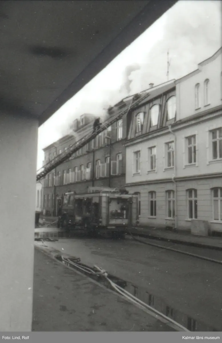 Brand på Strömgatan 10. Till vänster kv Gesällen 1. En kvarglömd kastrull fattade eld mitt i natten.