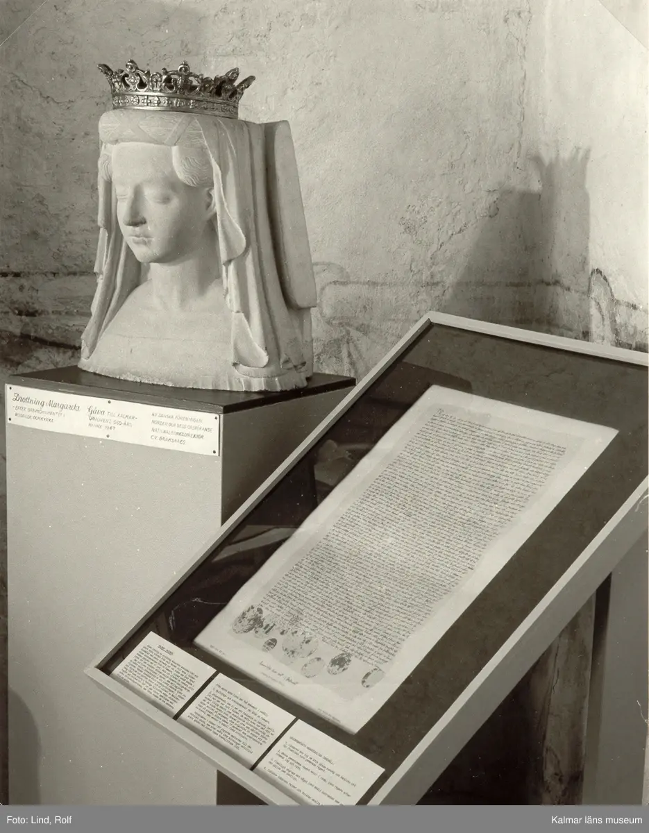 Porträtthuvud av Drottning Margareta och en facsimil av unionsbrevet från 1397 i Drottningsalen på Kalmar slott.