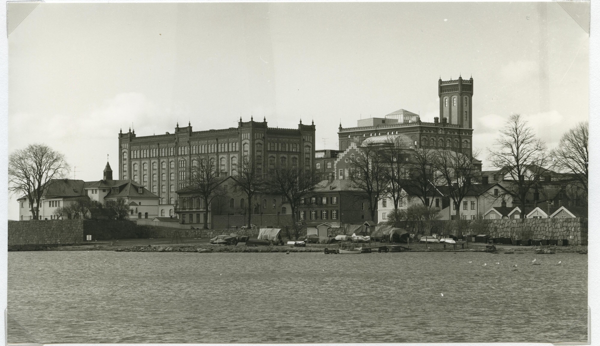 Kattrumpan sedd från Varvsholmen. I bakgrunden syns riskvarns- och ångkvarnsbyggnaden samt båtsmansstugorna.