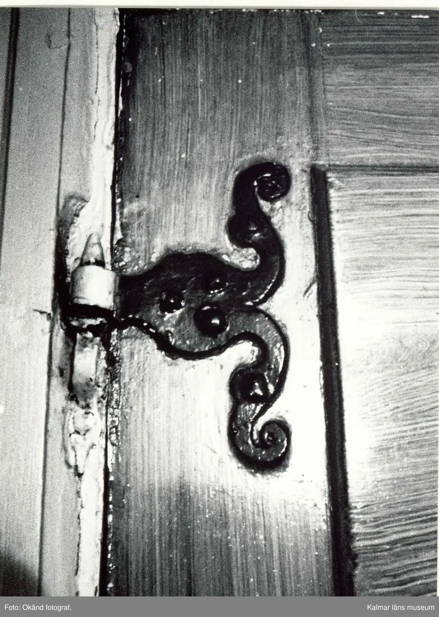 Ett gångjärn på en dörr till en byggnad i Huseby.