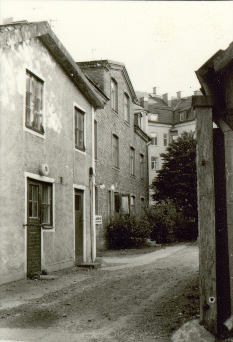 En gata och bostadshus med tegel och putsad fasad i kv Koljan.