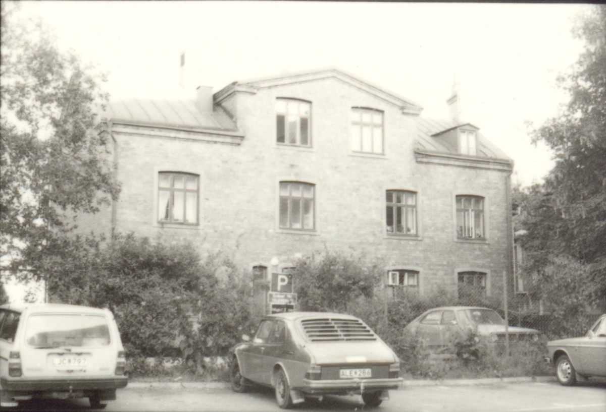 Bilar på en parkering och ett bostadshus med frontespis och tegelfasad i kv Koljan.