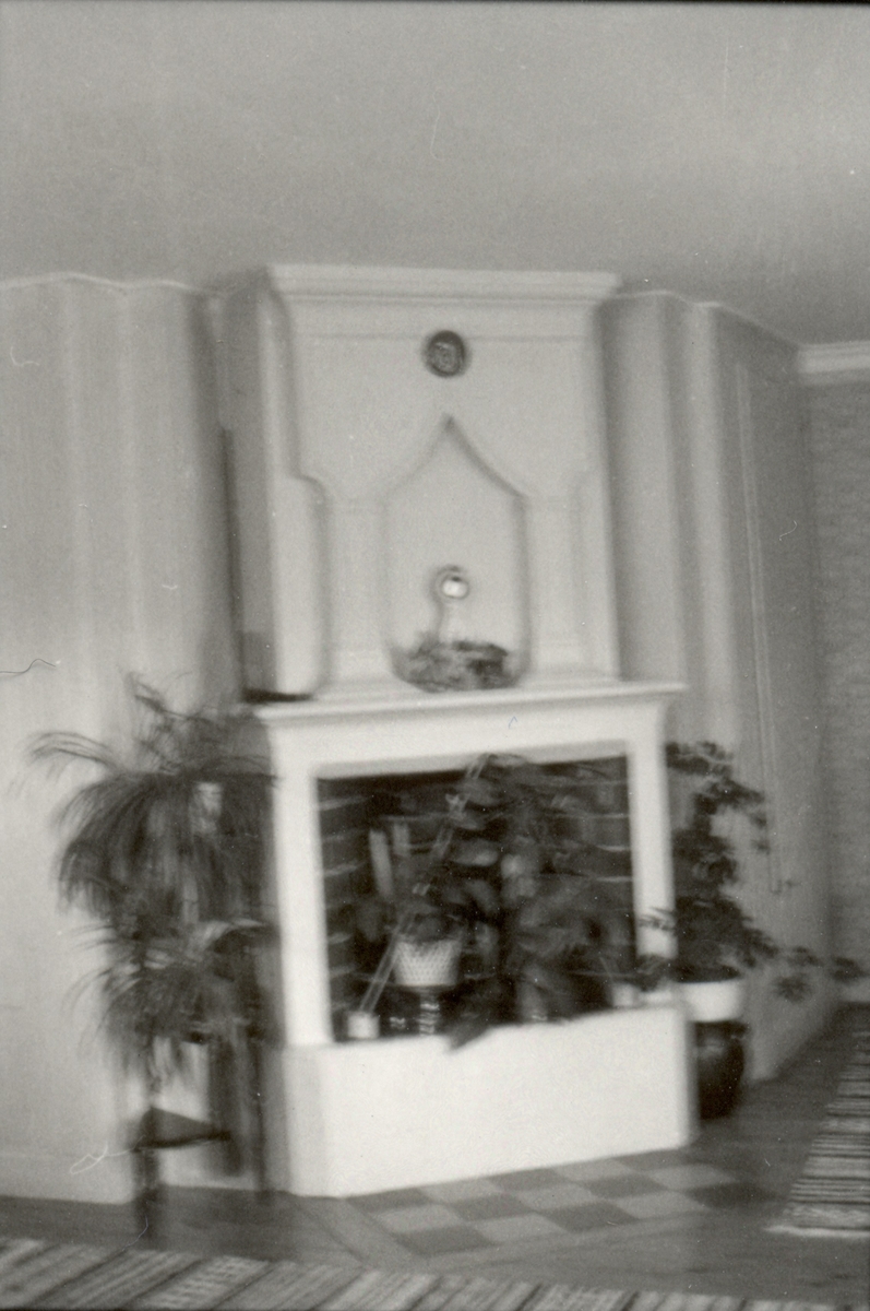 Manbyggnaden, öppen spis. Överdel med dekor av två pilastrar.