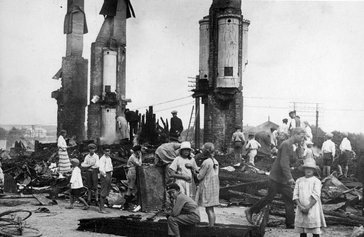 Ockelbobranden. Rester efter en eldsvåda i ett hus. Barn och vuxna har samlats vid brandresterna.