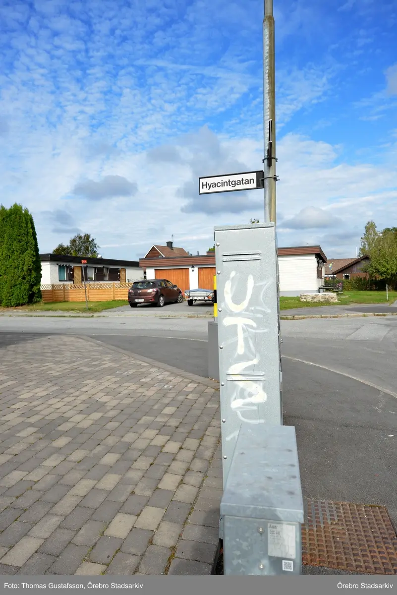 Gatuskylt och elskåp vid Hyacintgatan 1, 2016-09-22