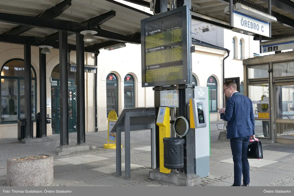 Biljettautomat och informationstavla vid Örebro Centralstation, Östra Bangatan 1, 2016-05-25