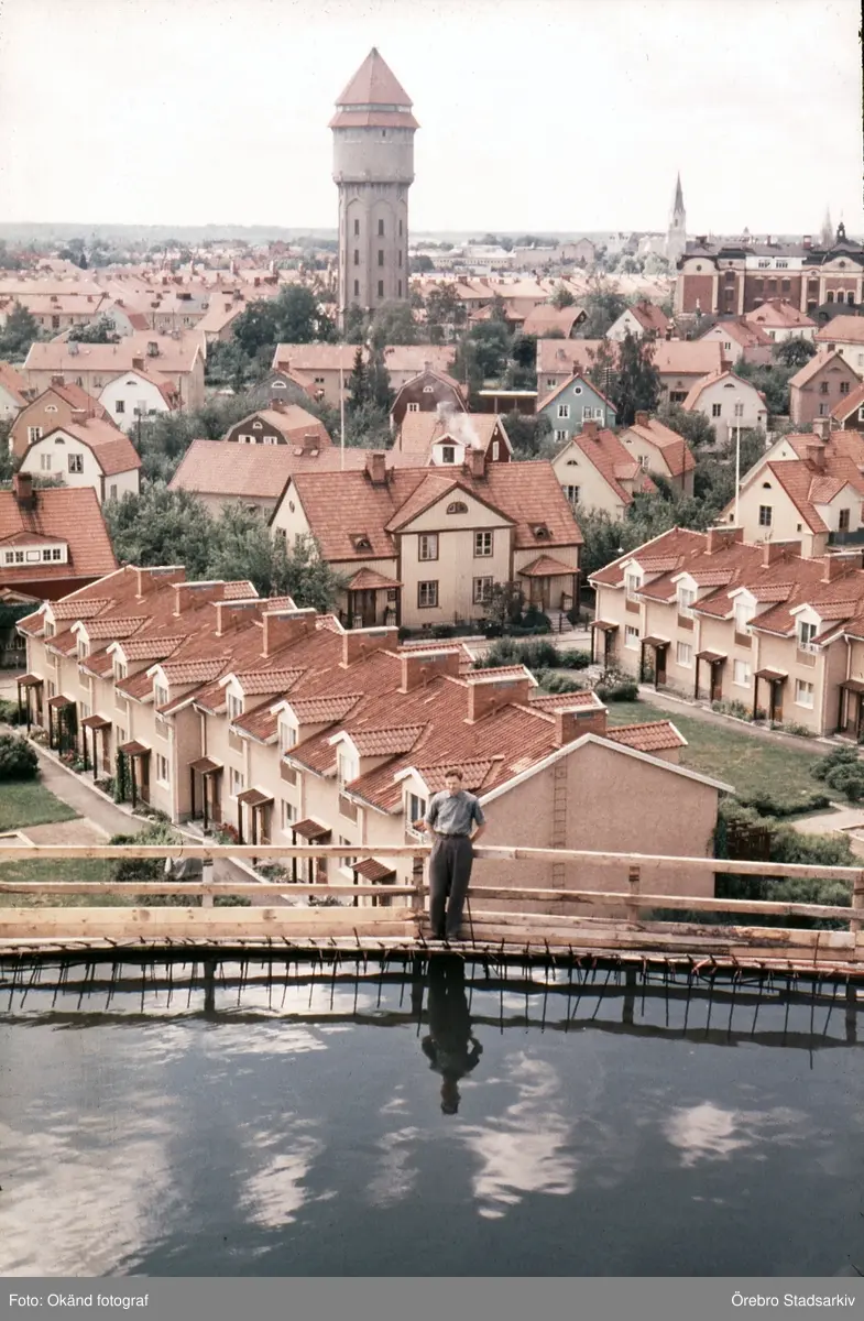 Man på vattentornet Svampens tak under byggnation, 1957-1958