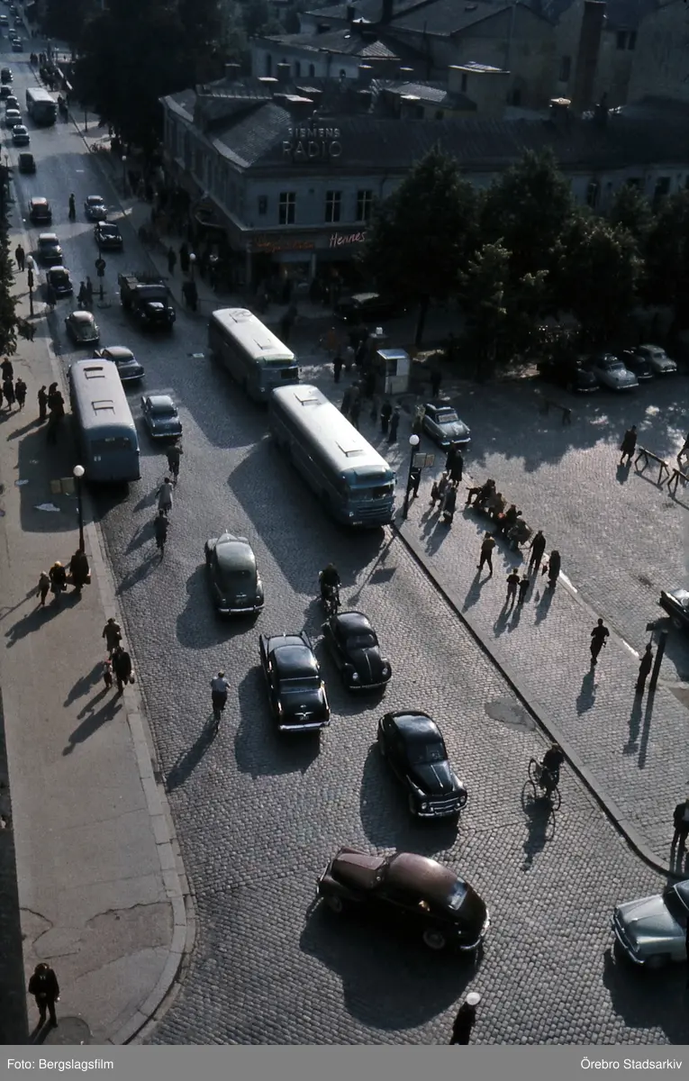 Bilar, bussar och cyklister i trafiken vid Järntorget, 1957