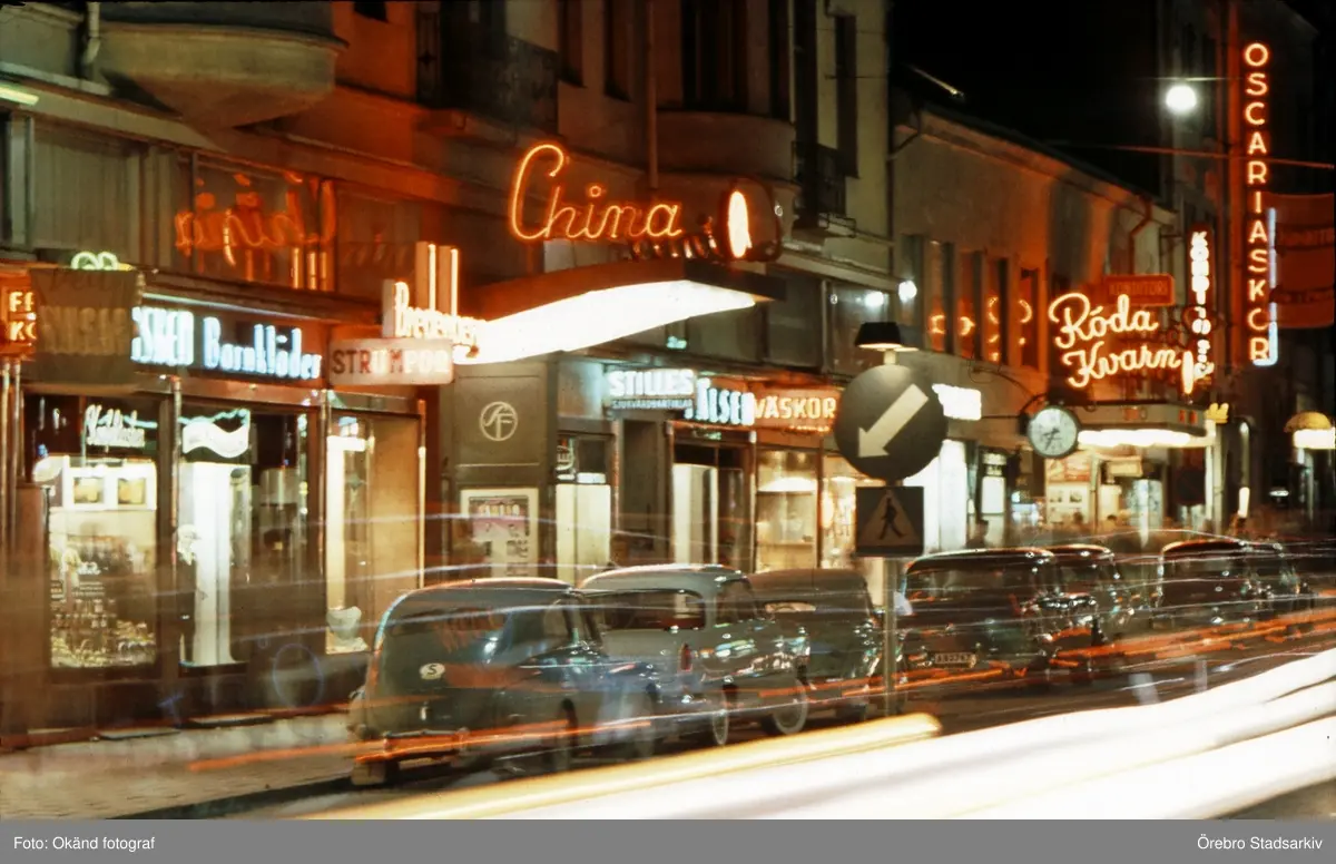 Biograferna China och Röda kvarn på Storgatan på natten, 1957