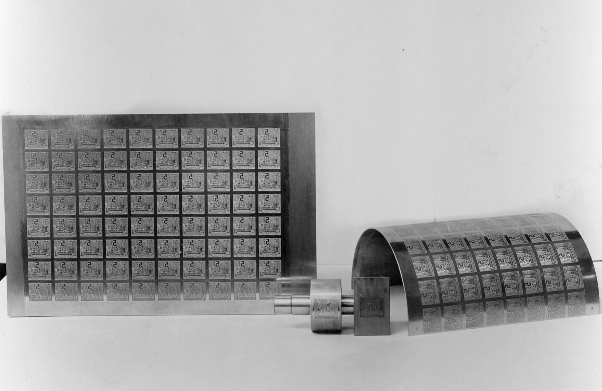 Från vänster: Rak tryckplåt, överföringsrulle, originalgravyr, böjd tryckplåt.