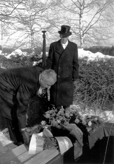 Sekreterare i Niittahon Jussin Seura Helsingfors Urho Juha nedlägger president Urho Kekkonen krans vid Nittaho-Jussis grav på Nyskoga kyrkogård 27/2 1965.