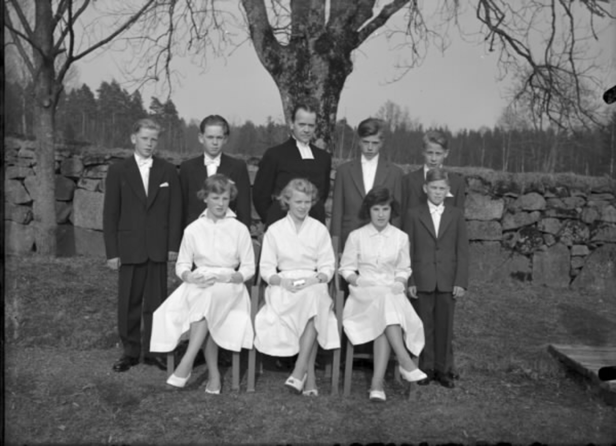 Konfirmandgrupp. Prästens namn är K H Roudén. Några av konfirmanderna är följande: Leopold Wallin, Leo Carlsson, Rune Svensson Gångarebo, Ingegerd Eliasson, Britt i Axet?, Dahlqvist