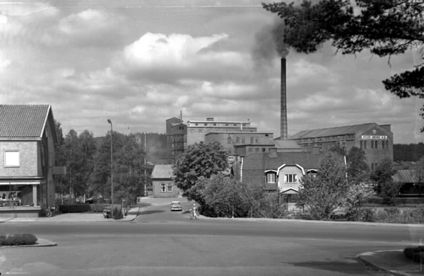 Hyltebruks pappersbruk sett från Bruksgatan, som korsar Storgatan i samhället. Affärsbyggnaden på hörnet till vänster säljer underkläder.