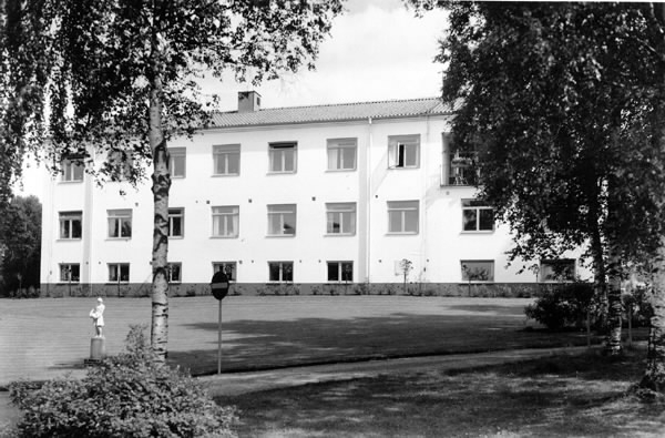 Exteriörbild av Hyltebruks sjukstuga. Till vänster ses en skulptur på sockel.