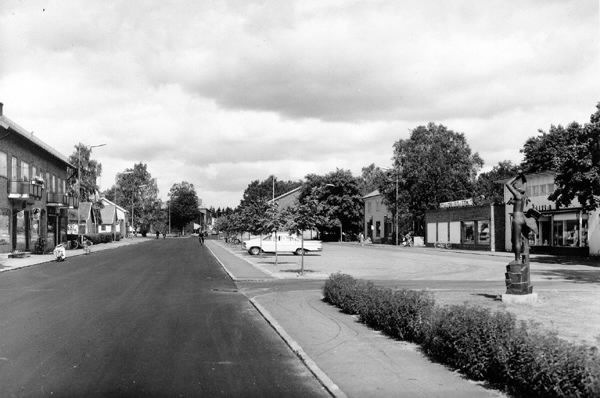 Vy längs Storgatan i Hyltebruk med torget på höger sida och skulpturen "Tjäderlek" av Thorwald Alef (1896-1974) i Hästskoparken. Affärsbyggnader och bostadshus kantar gatan.