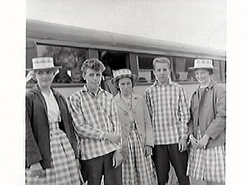 Fem ungdomar som är klädda i matchande rutiga skjortor och kjolar framför en buss. Flickorna har även rutiga, platta hattar.