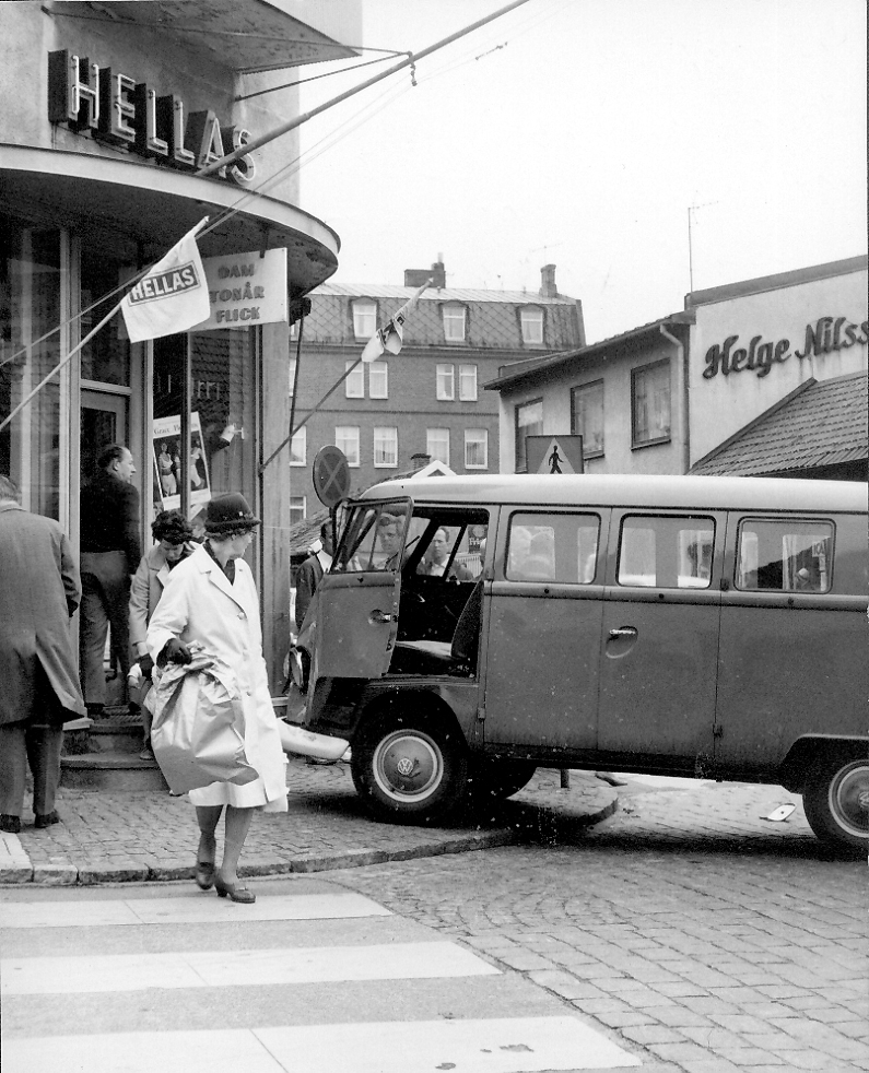Bild från artikel i Hallandsposten 1966-05-28, bildtext: "Efter sammanstötningen med bussen var skåpbilen nära att köra upp i entrén till Hellas ekipering." En krockskadad folkvagnsbuss står i en gatukorsning utanför butiken Hellas. Några personer betraktar olyckshändelsen. En dam är på väg över gatans övergångsställe. På andra sidan vägen görs reklam för Helge Nilssons.