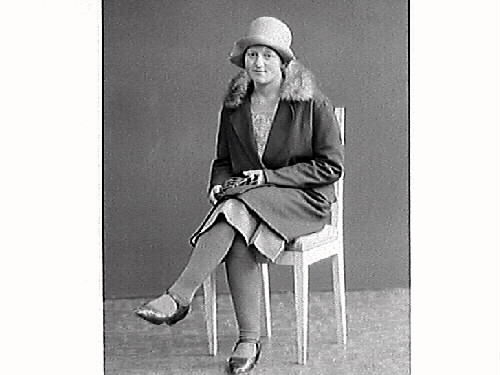 Porträtt av Anna Andersson, Vallby. Anna är klädd i hatt och kappa med pälskrage.