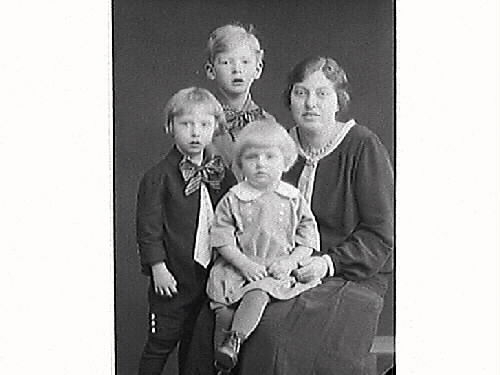 Komminister Aronius fru och tre söner. Barnen bär kortbyxor, strumpor och skor. Den minste är klädd i kolt med de två äldre har korta rockar, västliknande skjortor och stora halsrosetter.