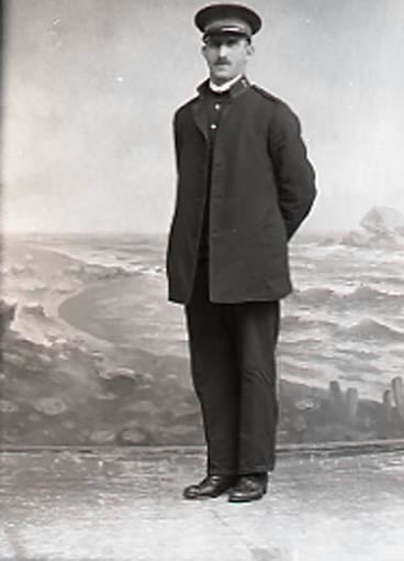 Ateljéfoto av man i Frälsningsarméns uniform, troligen beställaren själv, Karl Sjöberg, kv Falkenbäck i Varberg.