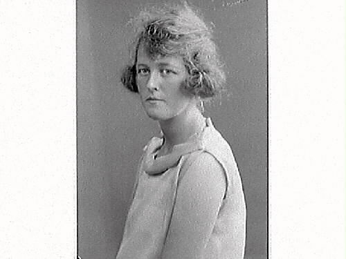 Kvinnoporträtt av fröken Bremberg i ärmlös klänning med sjalkrage.