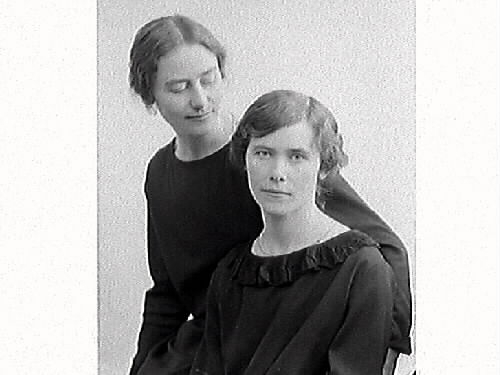 Två unga kvinnor i mörka klänningar, där den ena tittar in i kameran medan den andra riktar blicken mot henne. Fröken Bergendahl beställde bilden och är troligen en av kvinnorna.