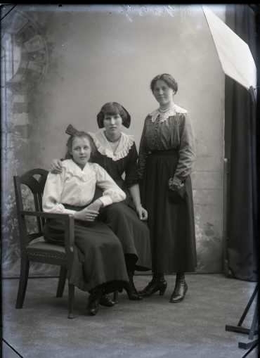 Kvinnoporträtt, ateljébild med tre unga kvinnor. Beställare: Gerda Pehrsson. Troligen tagen i Björkströms ateljé i Falkenberg, råbild avsedd att beskäras.