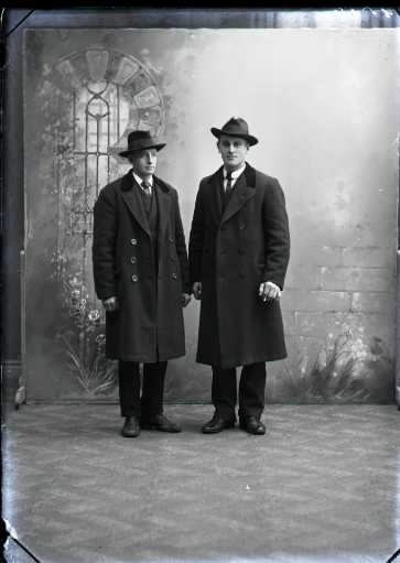 Ateljébild med två män i kostym, hatt och överrock, varav beställaren Gustav Johansson, Falkenberg sannolikt är en av dem. Troligen är bilden tagen i Björkströms Falkenbergsfilial.
