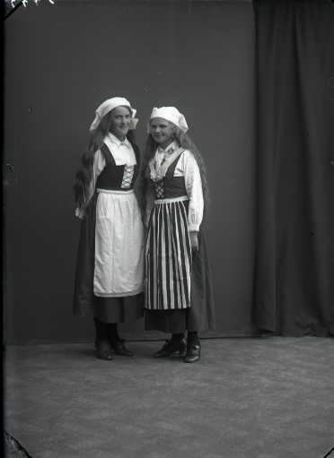Ateljéfoto med två flickor i hembygdsdräkt, beställare: Tekla Gustavsson. Troligen är bilden tagen i Björkströms Falkenbergsfilial.