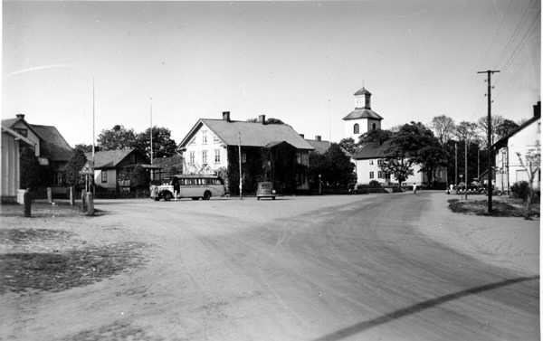 Vykort, "Torget Unnaryd", Södra Unnaryd. På torgytan, som bildas i vägkorsningen, står en buss och en bil parkerad framför ett tvåvåningshus. Till höger ses Södra Unnaryds kyrka.