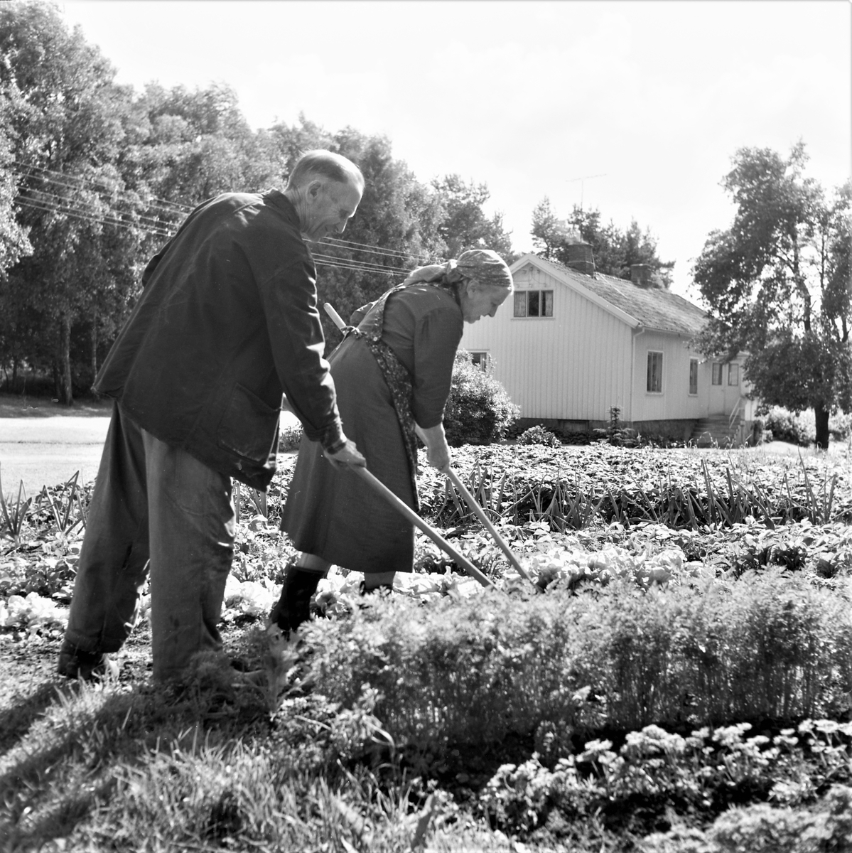 Knut och Maria Öberg rensar ogräs i trädgårdslandet.