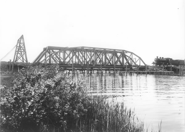 Järnvägslinjen Västkustbanan. Ett ånglok är på väg över järnvägsbron över Viskan i Åskloster.