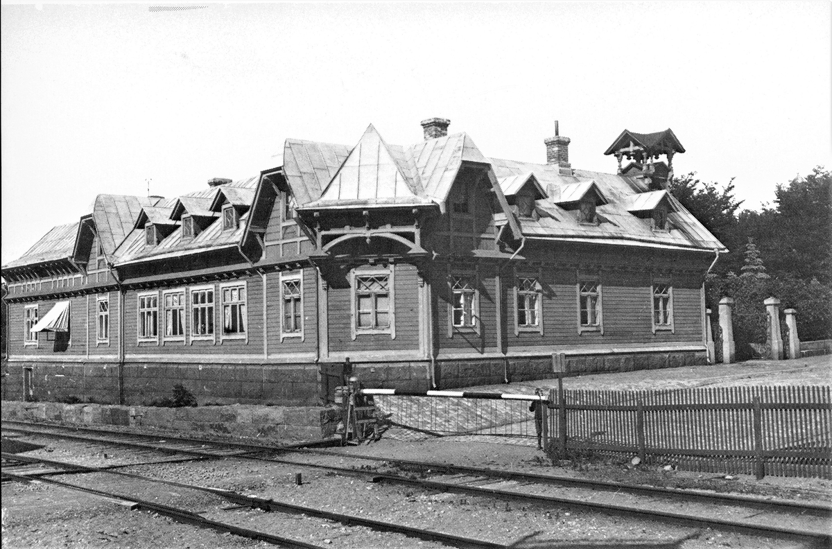 De så kallade Gerlachska stallarna som fungerade som stallar med foder- och selkammare samt bostäder åt Hugo Gerlachs tjänstefolk. Byggnaden uppfördes 1887 i U-form med en artikulerad gesims under brokiga takfall med många takkupor och vällingklocka, i hörnet av Bäck- och Slottsgatorna. Till höger om huset ses grindpartiet in till trädgården. Järnvägen fick ny sträckning söderut 1920 och på bilden ses järnvägsbommen för Bäckgatan. Stallarna inreddes till lägenheter som beboddes fram till 1980-talet, men 1985 brann byggnaden ned.
