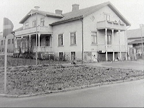 John Förstbergs bostadshus vid handelsträdgården på Södra Hamnvägen. Bild 2: Vy via byggnadens hörn mot Gerlachska stallarna i kv Trädgården och bebyggelsen däromkring vid Bäckgatan.