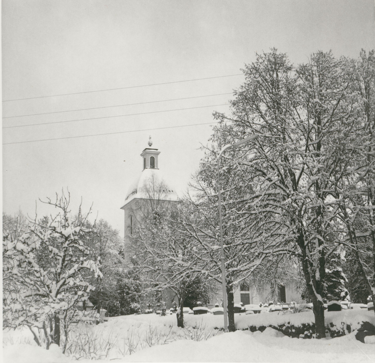 Blackstads kyrka. Foto från sydväst (från församlingshemmets trappa), taget före avverkningen i mars 1969.