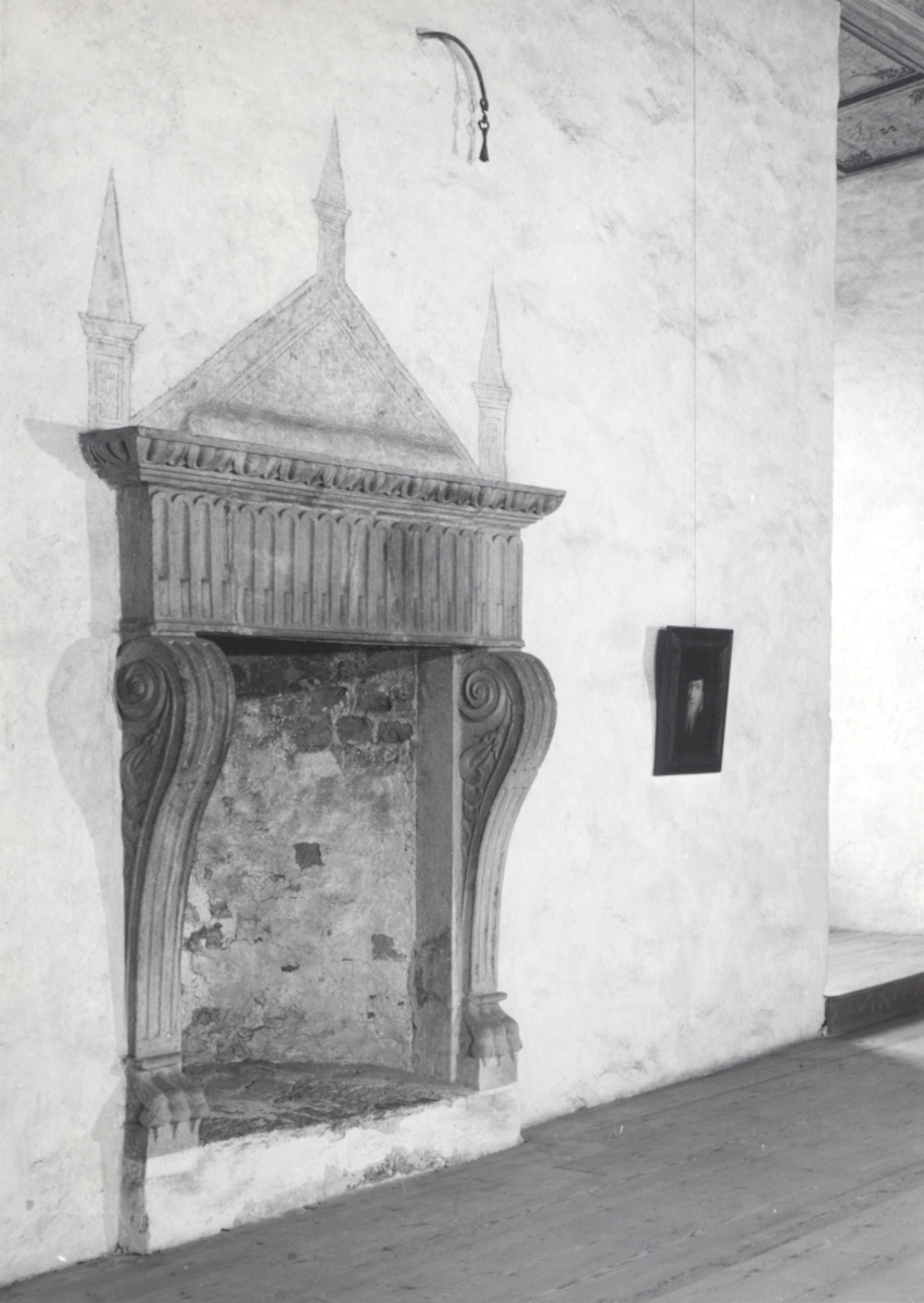 Öppen spis med trompe-l'oeil-målning i Gyllene salen på Kalmar slott.
