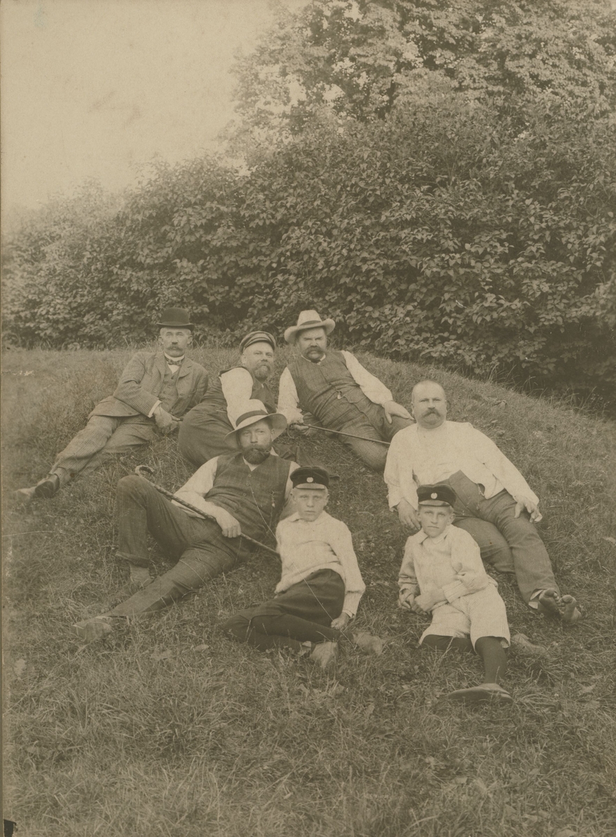 Karl Kullzén, bokbindare till yrket. Född 22/1 1866 i Farhult socken, död 29/12 1928 i Kalmar. Karl Kullzén liggande på gräset längst till höger på bilden nedanför sig har han sonen Henning?