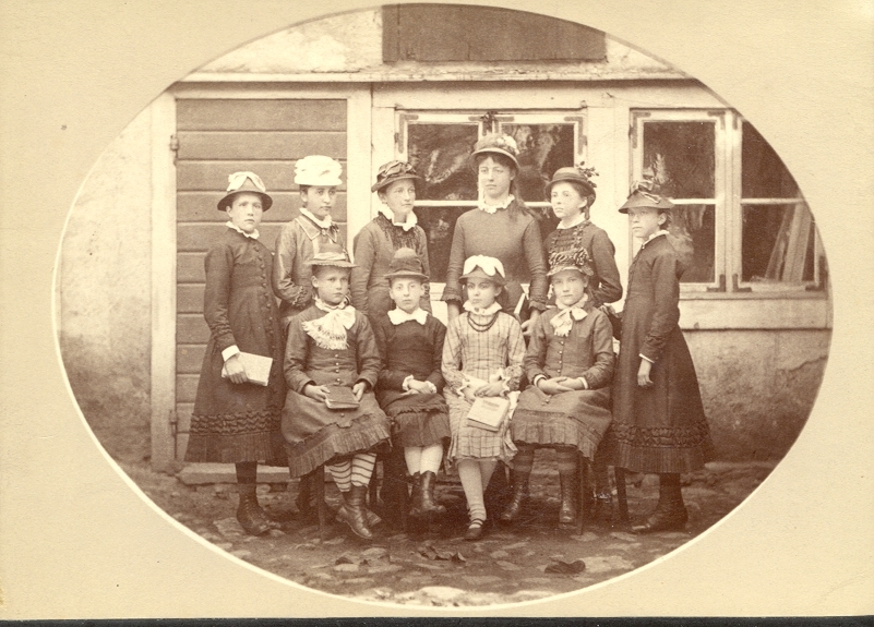 Grupporträtt av okända flickor. Möjligen en grupp från en flickskola.
