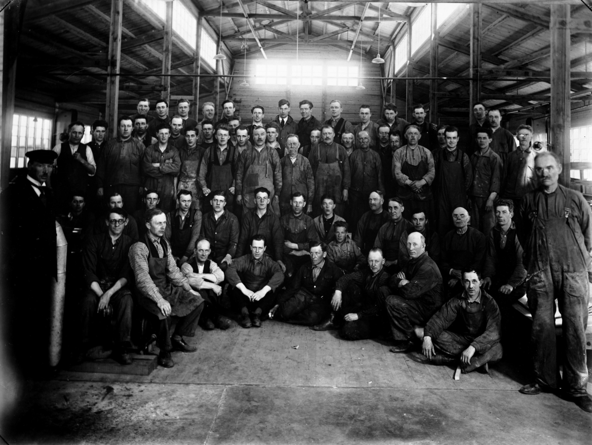 Bilden är tagen i en av Kalmar Verkstadsaktiebolags lokaler och visar en grupp av anställda vid företaget. De flesta av de avbildade är verkstadsarbetare.