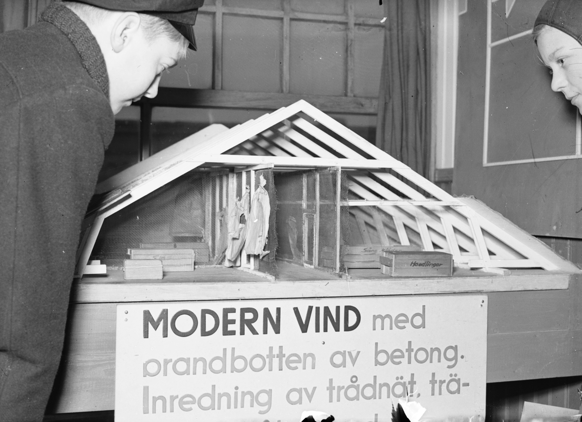 Luftskyddsutställning. Modell av en vind. " Modern vind med brandbotten av betong ". Mars 1939. Reportage för Gefle Dagblad