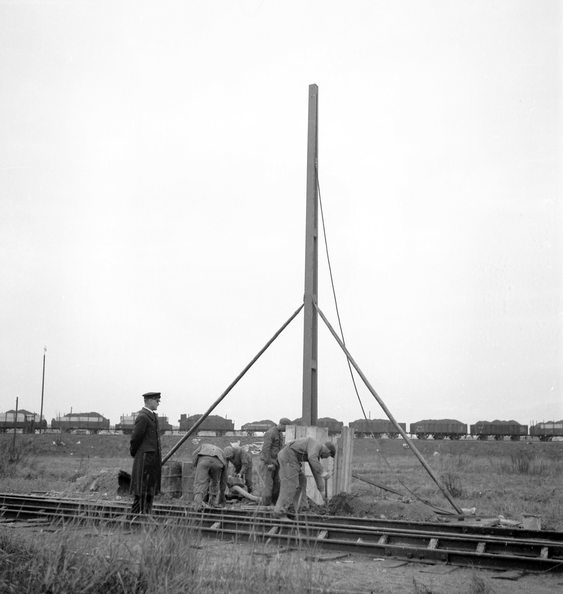 Titel: Reportage för Gefle Dagblad. Resning av stolpar. Centralen. År 1936