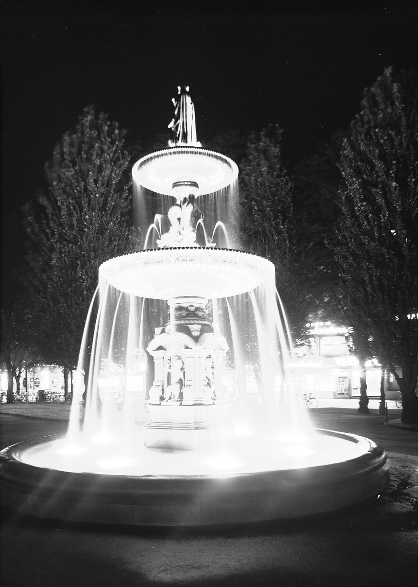 Fontän i elljus, skapades 1880. Gjutjärnsskulptur med avsatser i två våningar, målad, 4 m höga socklar och bassäng i granit. Fontänen mot teatern framställer Leda och svanen (guden Zeus förvandlar sig till upphetsad svan för att kunna lägra den avvärjande Leda). Gåva av Anders Magnus Hedberg.