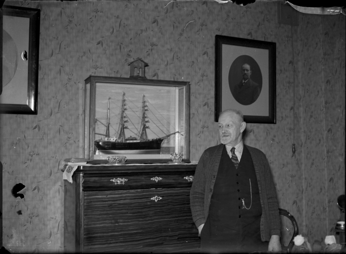 Sjökapten Carl Wilhelm Zettergren (1860-1950) bredvid en modell av ett barkskepp. Vid bouppteckningen 1938 efter Carl