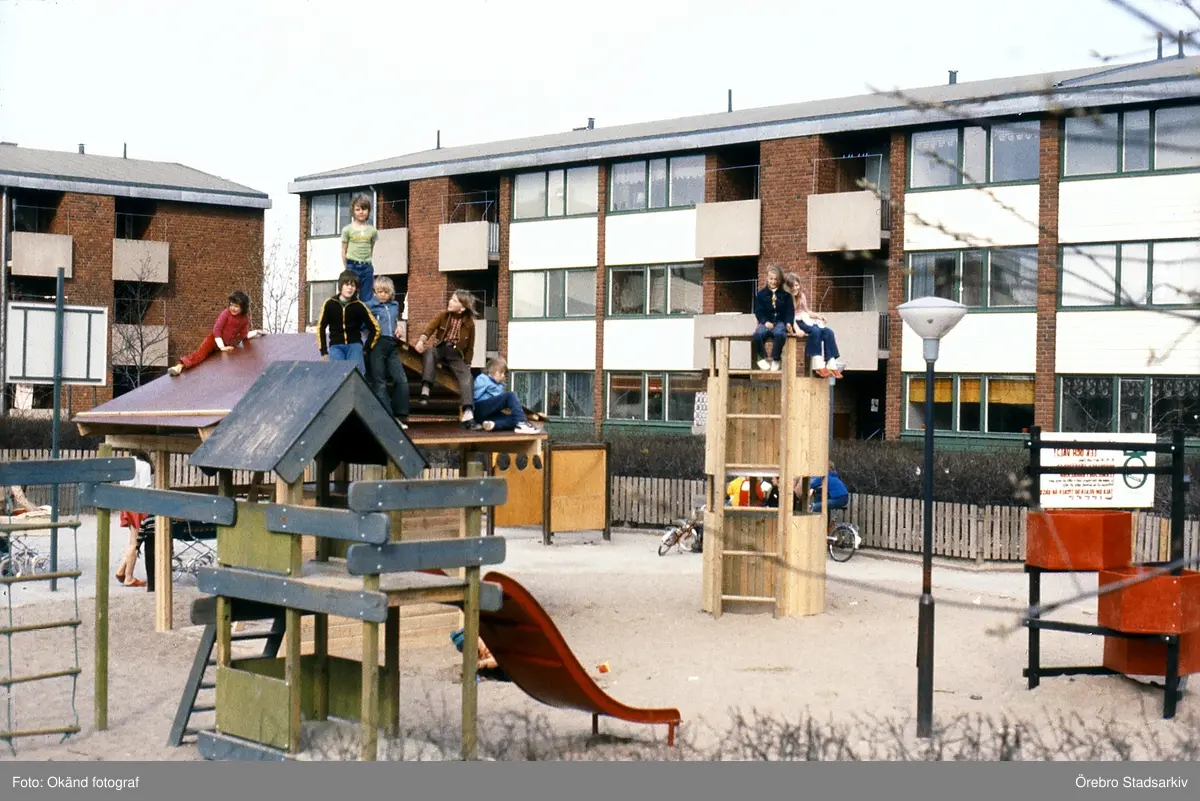 Barn på klätterställning och lekhustak i Varberga, 1970-tal