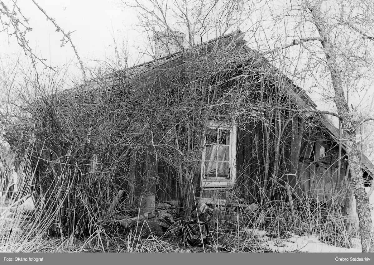 Igenväxt gammal stuga i Yxtabacken i Hovsta, 1981
