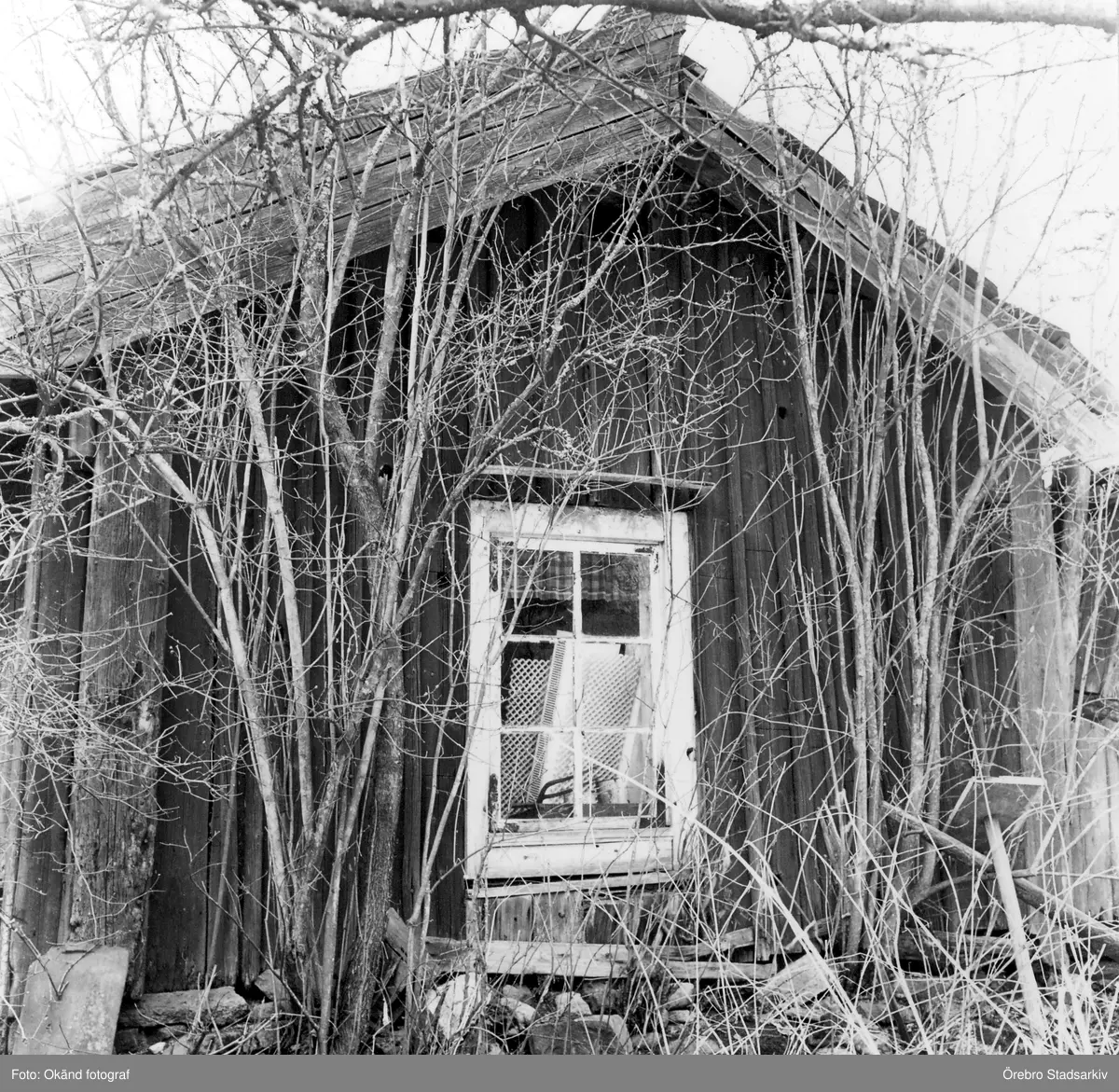 Trasiga fönster på gammal stuga i Yxtabacken i Hovsta, 1981