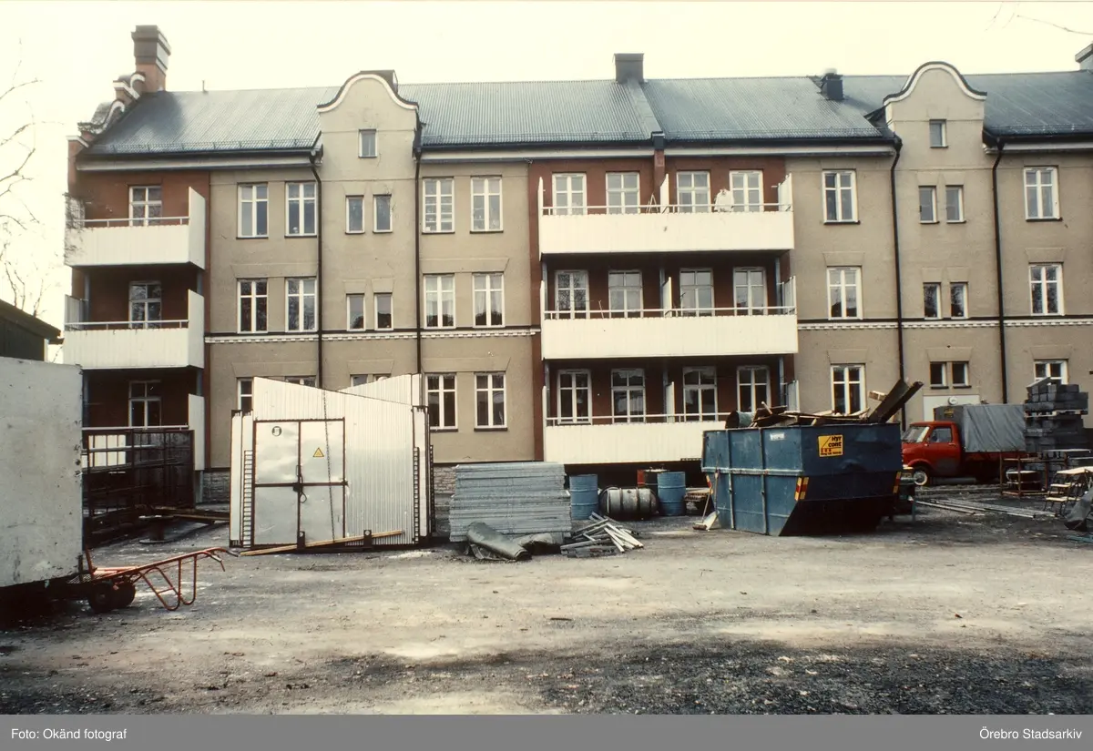 Byggarbetsplats vid hyreshus på Markgatan 21, 1982