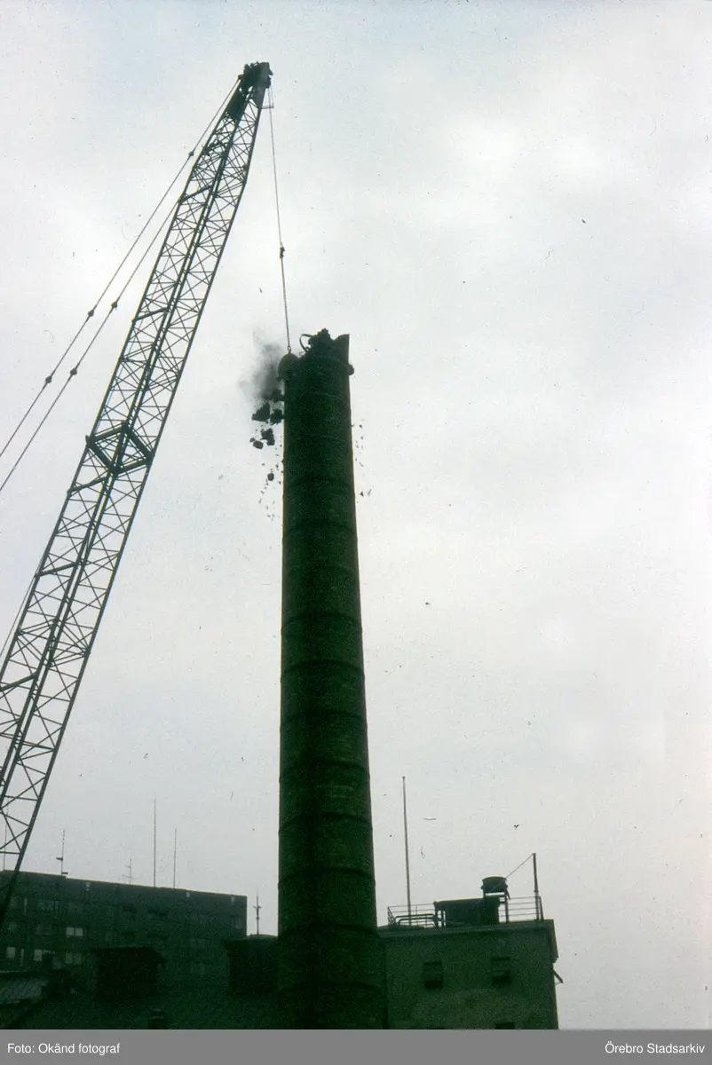 Lyftkran raserar övre delen av skorstenen vid Norlings bryggeri, 1970