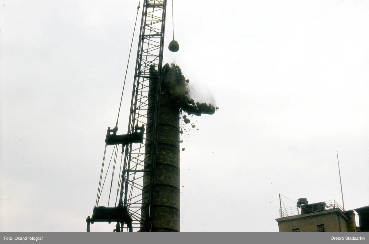 Stenar rasar vid rivning av skorstenen vid Norlings bryggeri, 1970