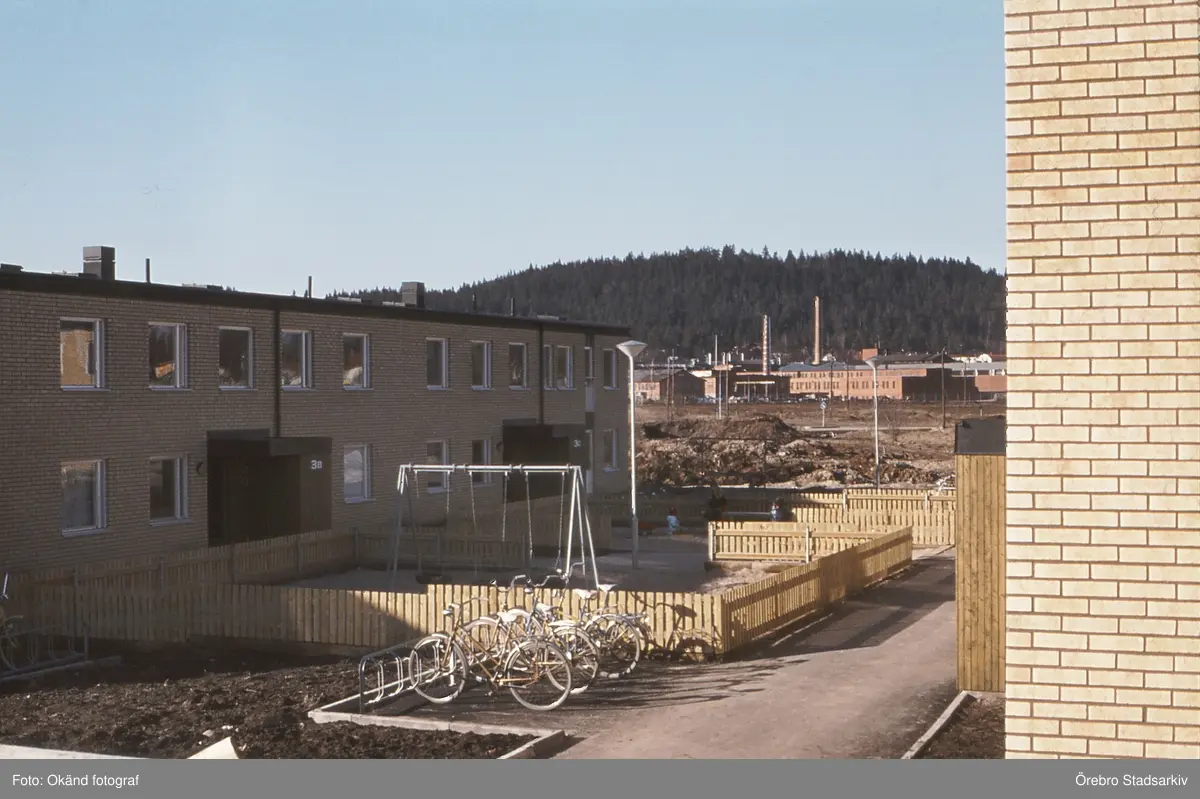 Lekplats och cykelställ bland hyreshus i Garphyttan, 1970-tal